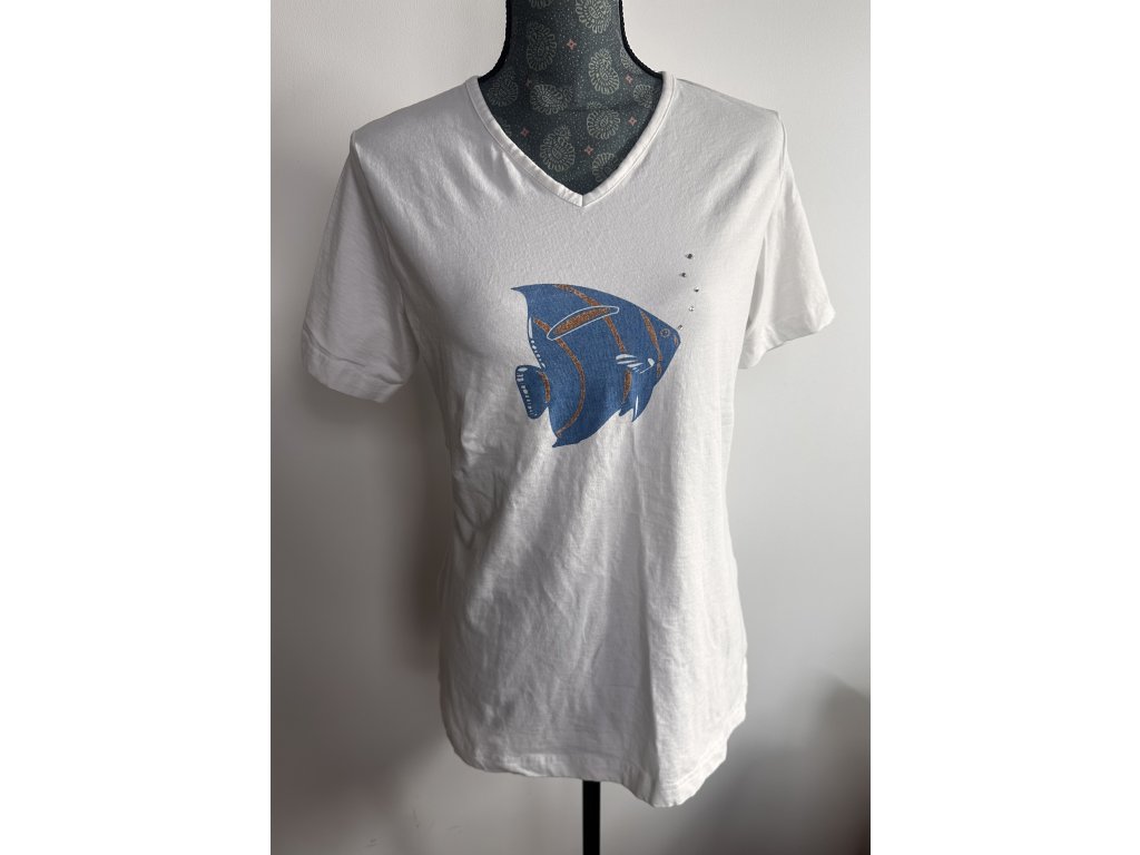 Bílé tričko s modrým potiskem ryby, příjemný materiál a pohodlný střih.
