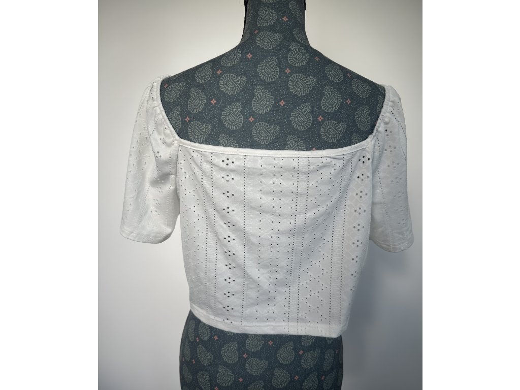 Bílý krajkový crop top s krátkým rukávem a výšivkou, velikost XL.