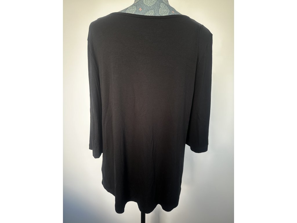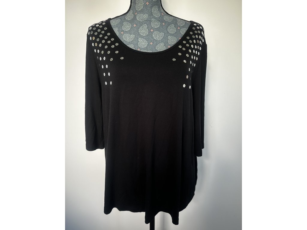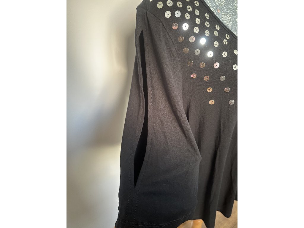 Černé tričko se stříbrnými flitry v horní části dodá vašemu outfitu šmrnc. Zajímavostí jsou rozparky na rukávech, které tričku dodávají jemný nádech originality. Měkký, splývavý materiál je velmi příjemný na nošení. Skvěle se hodí ke kalhotám i sukni.