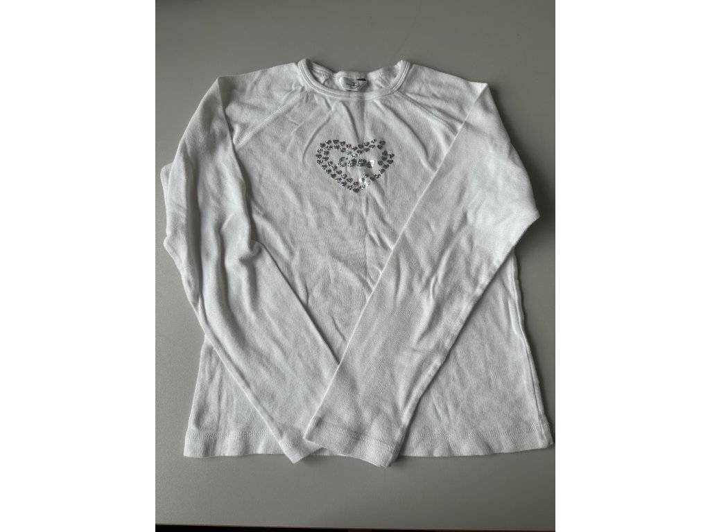 Bílé dětské tričko s dlouhým rukávem a třpytivým srdíčkem, jemně nošené s drobnými flíčky.