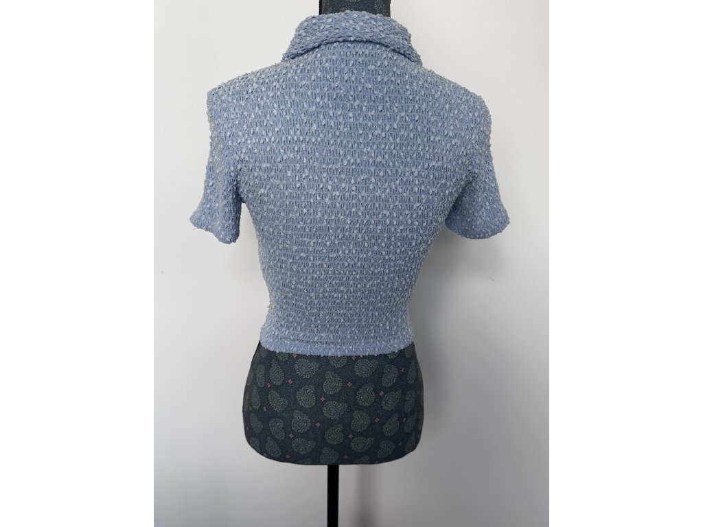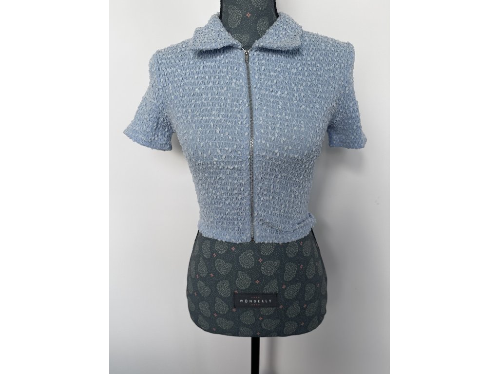 Krátký modrý top s límečkem a zipem. Strukturovaný materiál, retro styl a přiléhavý střih, který zvýrazní postavu.