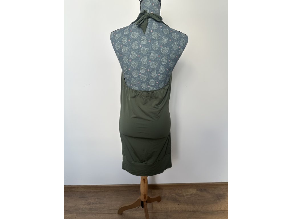 Elegantní olivové minišaty od značky Silvian Heach. Zavazování za krk vytváří odhalená ramena a krásně zvýrazní šíji, zatímco lehký materiál příjemně obepíná postavu. Výstřih do vodopádu dodává modelu jemnost i ženský půvab. Skvělé k podpatkům i jednoduchým sandálům.