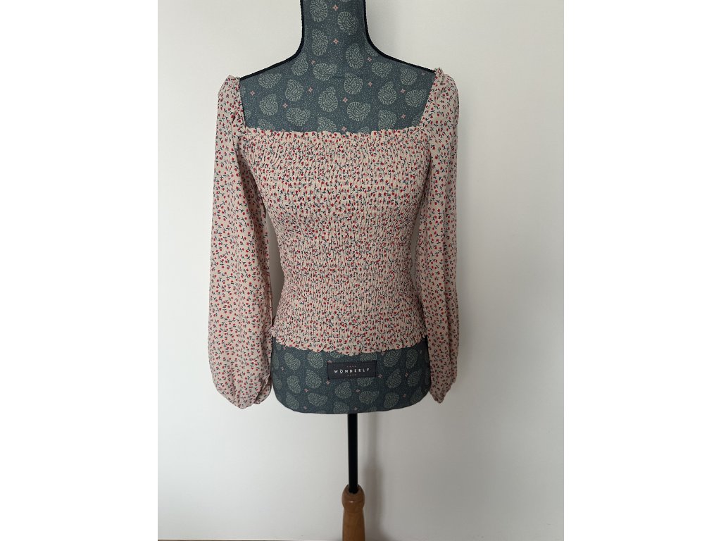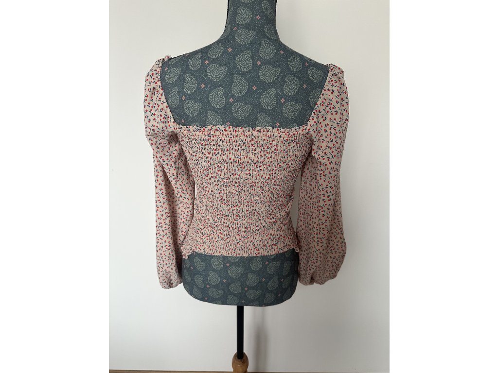 Smetanová halenka s drobným květinovým vzorem, která se díky elastickému žabičkování krásně přizpůsobí postavě. Dlouhé nabírané rukávy zakončené jemnou gumičkou dodávají něžný nádech, stejně jako čtvercový výstřih. Skvělý kousek k džínám i sukním, který lichotí ženské siluetě a hodí se jak na všední den, tak i na schůzku nebo letní procházku.