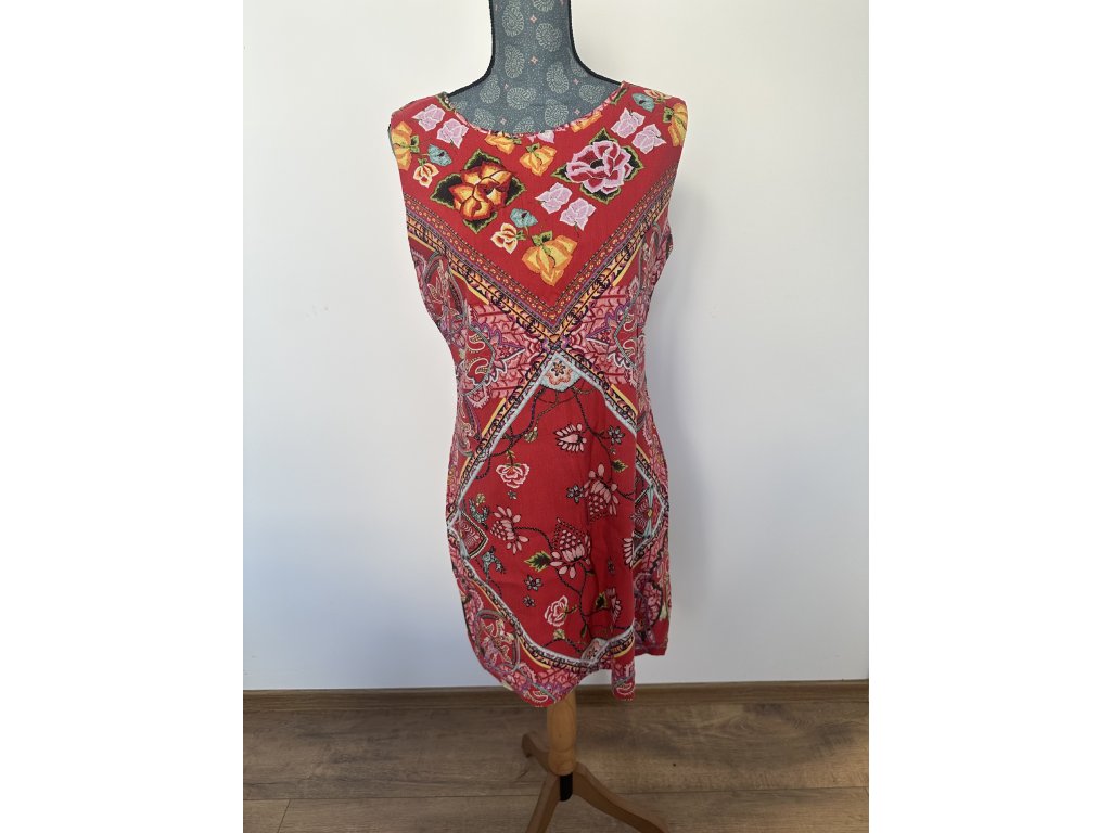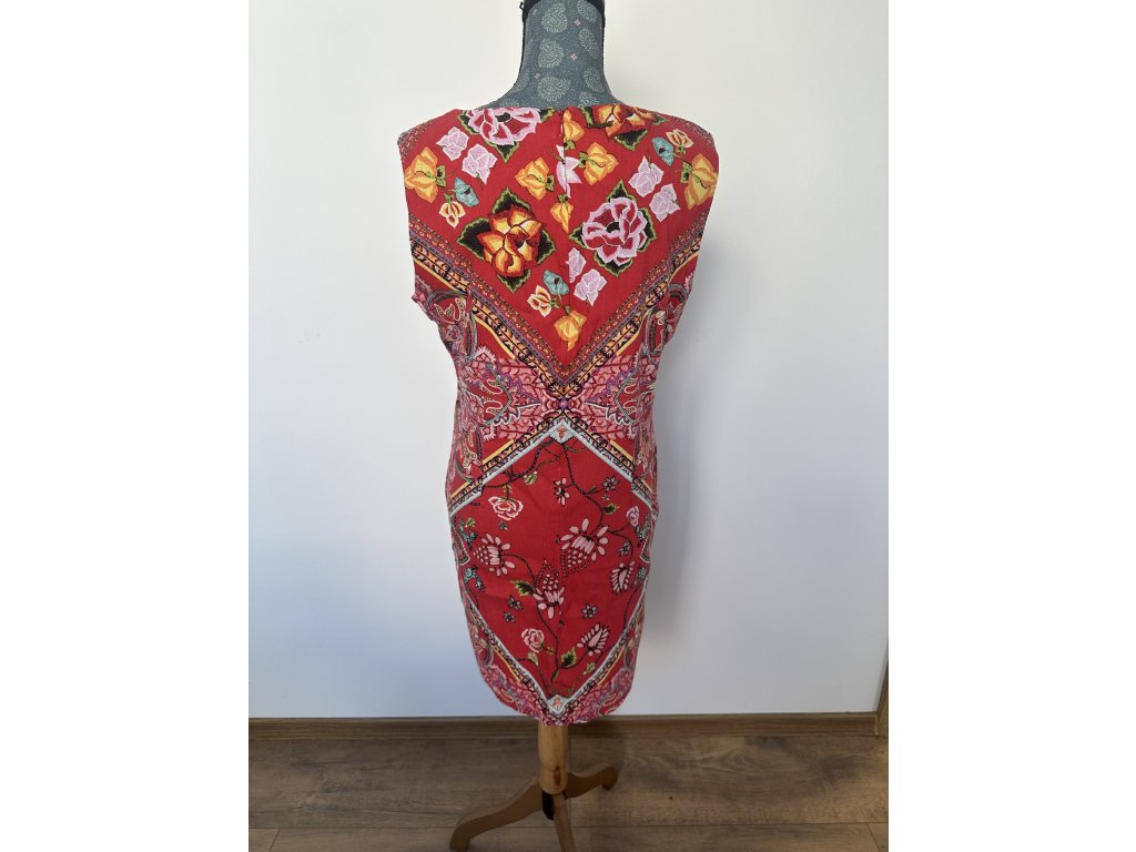 Letní šaty od značky Desigual v zářivě červené barvě s výrazným květinovým vzorem. Střih jemně tvaruje postavu, má kulatý výstřih a skryté zapínání na zip na zádech. Pevnější a zároveň prodyšný materiál je ideální na teplejší dny nebo slavnostní příležitosti.